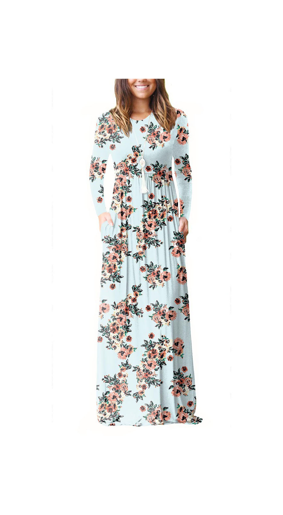 Women Floral Print Maxi Dress Long Sleeve Pockets Beach Boho Long
