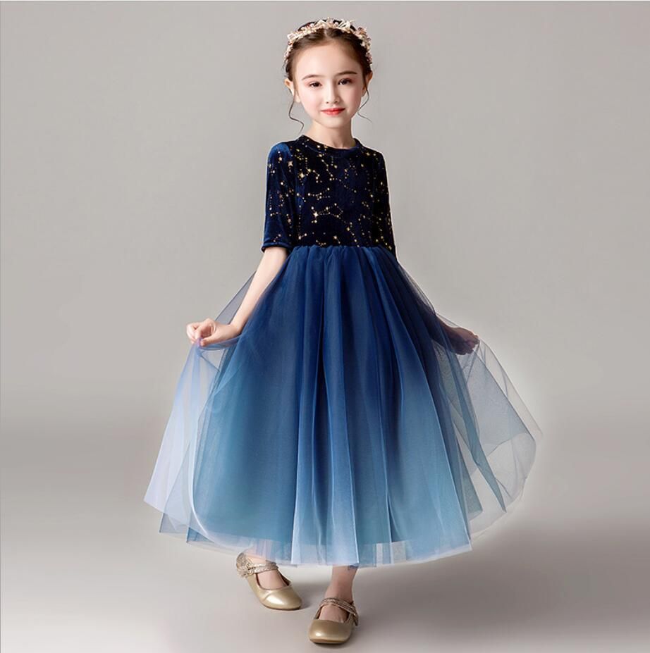 Birthday Party Long Girl Dress Christmas Kid Formal Navy Blue