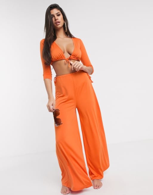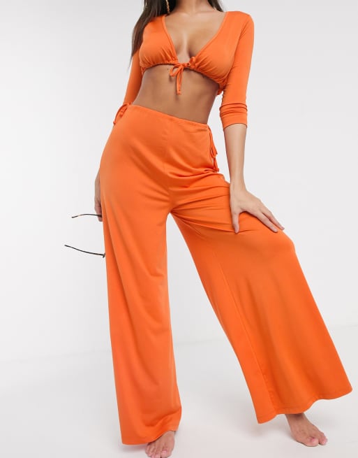 Asos Design Jersey Orange Slinky Tie Waist Wide Leg Beach Pants