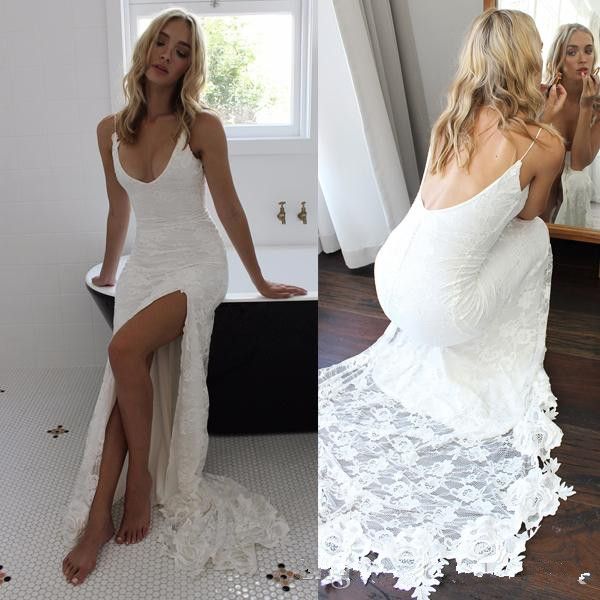 2020 V Neck Chic Lace Bohemian Casual Tulle Wedding Dresses Open