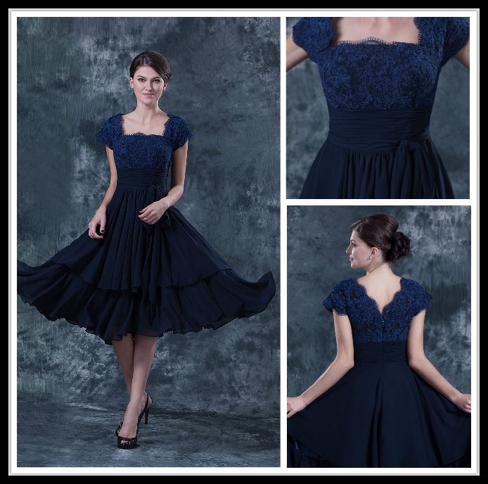 Vintage Navy Blue Square Lace Cap Sleeve Chiffon Short Mother Of