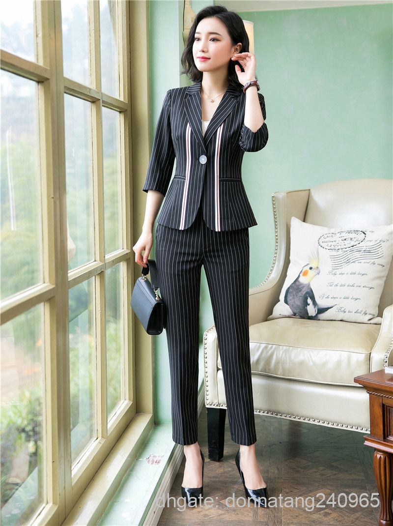 2020 Office Blazer Pant Suit Women Casual Stripe Jacket With Long