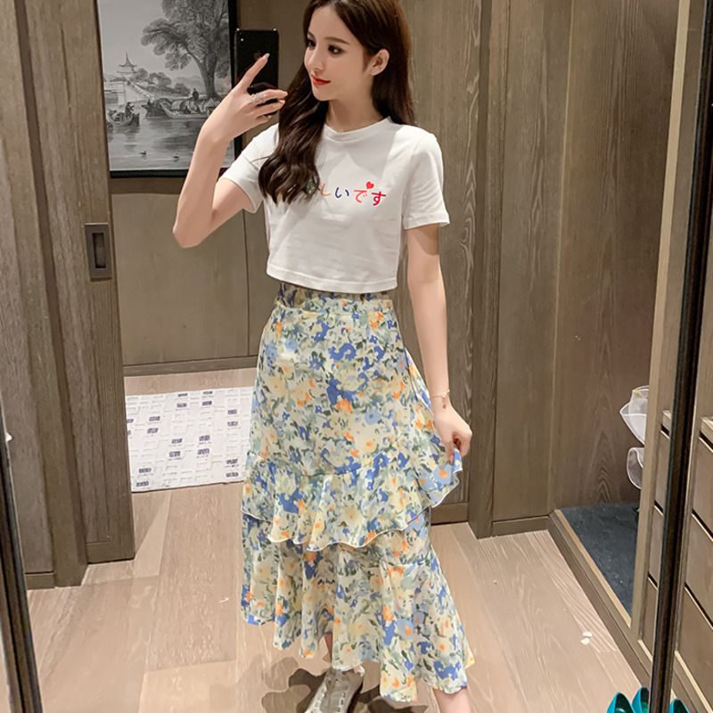 2020 Sweet Korean Summer Two Piece Women Short White T Shirt Crop