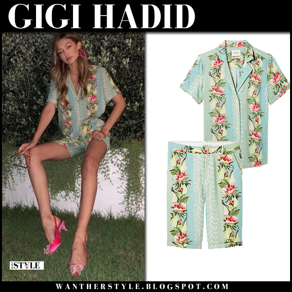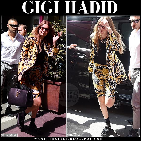 Gigi Hadid In Yellow Baroque Print Blazer And Bike Shorts In Milan