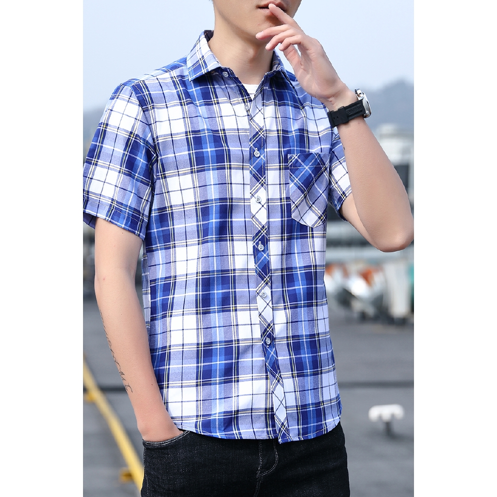 New Men S Business Casual Plaid Printed Cotton Short Sleeved Shirt