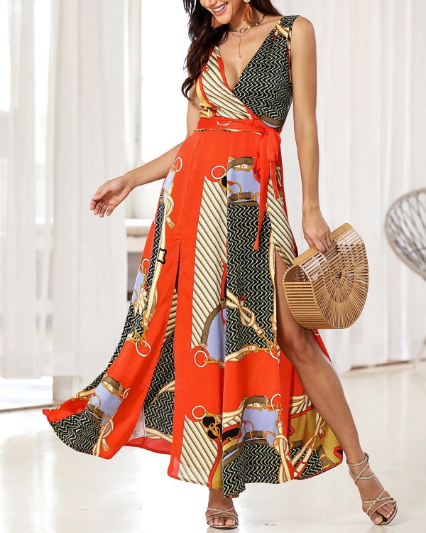 Dark Blue Floral Print V Neck Wrap Slit Chiffon Casual Maxi Dress