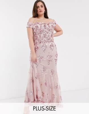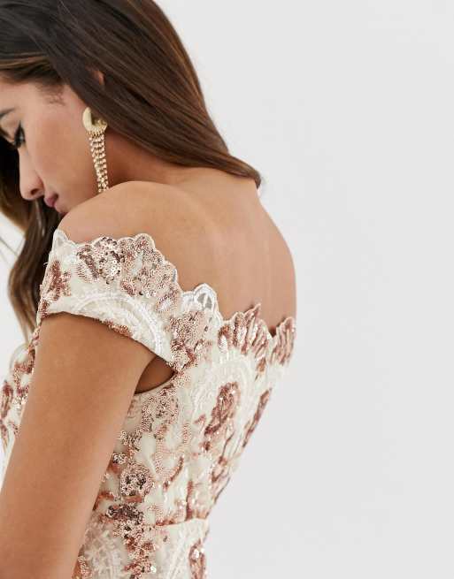 Honey Couture Hailey Rose Gold Sheer Sequin Off Shoulder Evening Gown