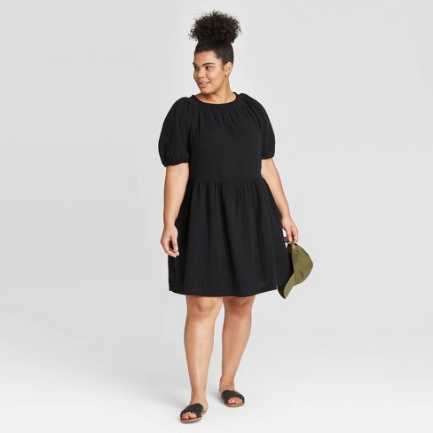 Black Unlined Crew Neck Cotton Plus Size Dress