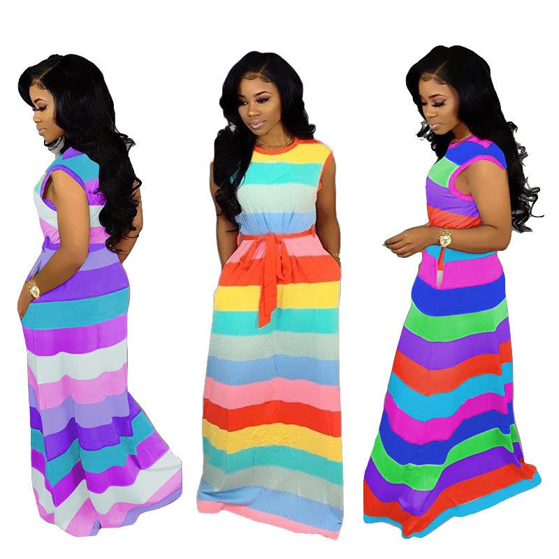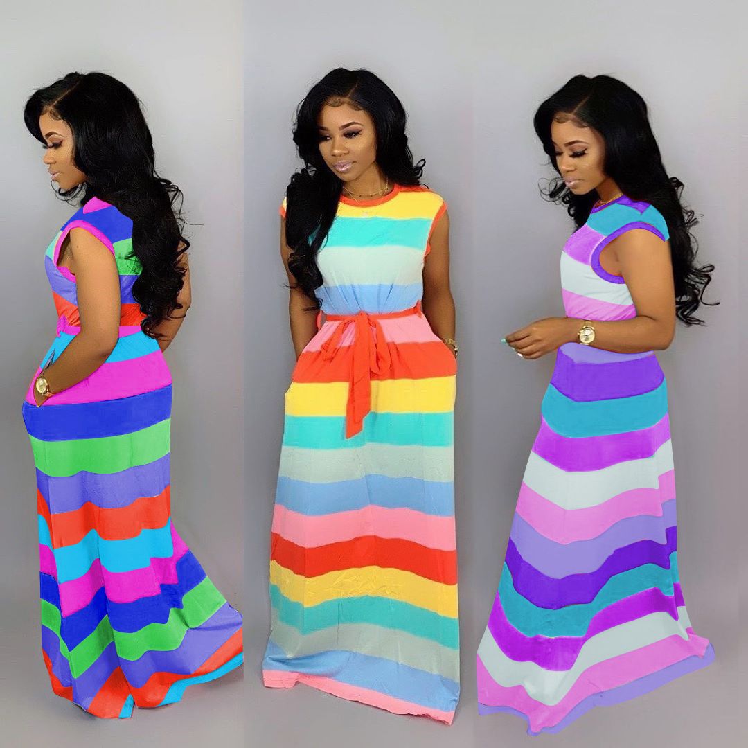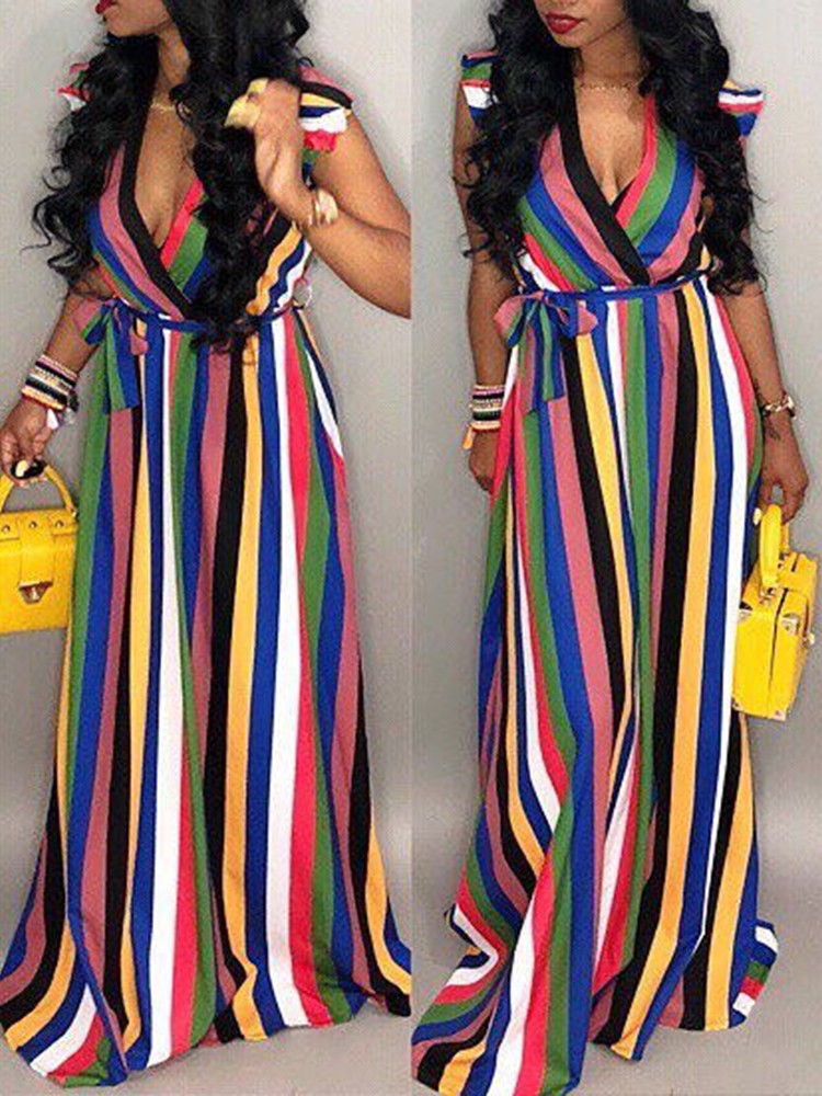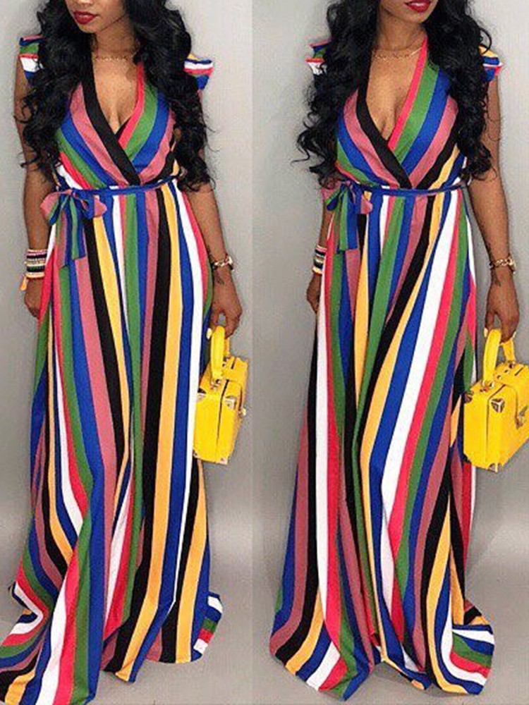 Rainbow Color Striped Belted Casual Wrap Dress