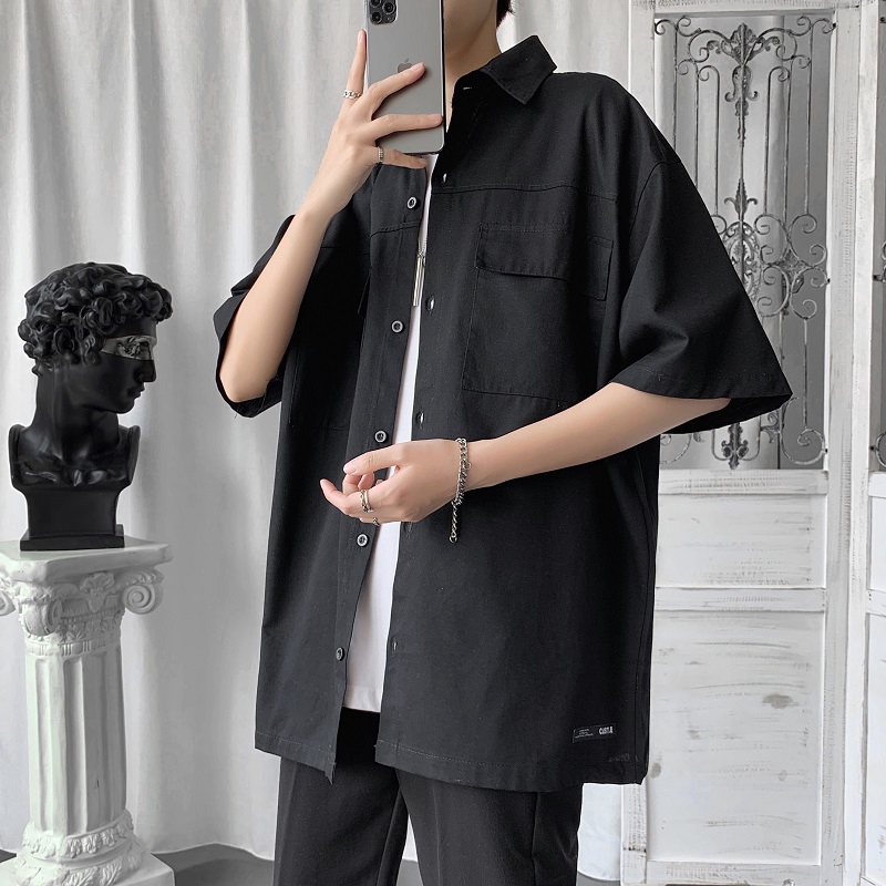 Korea Solid Color Seven Quarter Sleeve Shirt Man Kemeja Pria